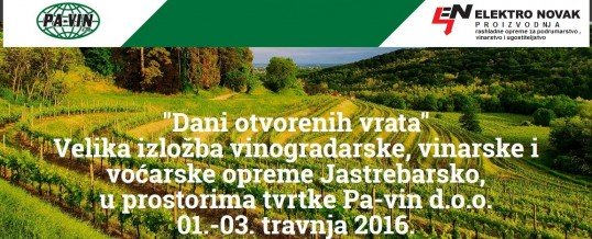 Opširnije →Velika izložba vinogradarske, vinarske i voćarske opreme Jastrebarsko, u prostorima tvrtke Pa-vin d.o.o. Od 01. – 03. travnja 2016.g. Vrijeme izložbe 9.00 – 18.00 sati. Više…